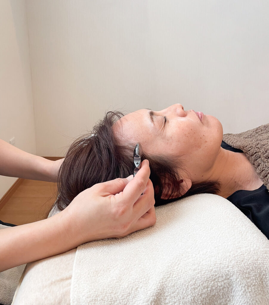 専用のプレートを用いて頭皮を優しく、時にはしっかりとこすることで、滞りがちな頭部の巡りを活発にします。頭の筋肉と筋膜の緊張を緩めることで、次のような嬉しい変化が期待できます。